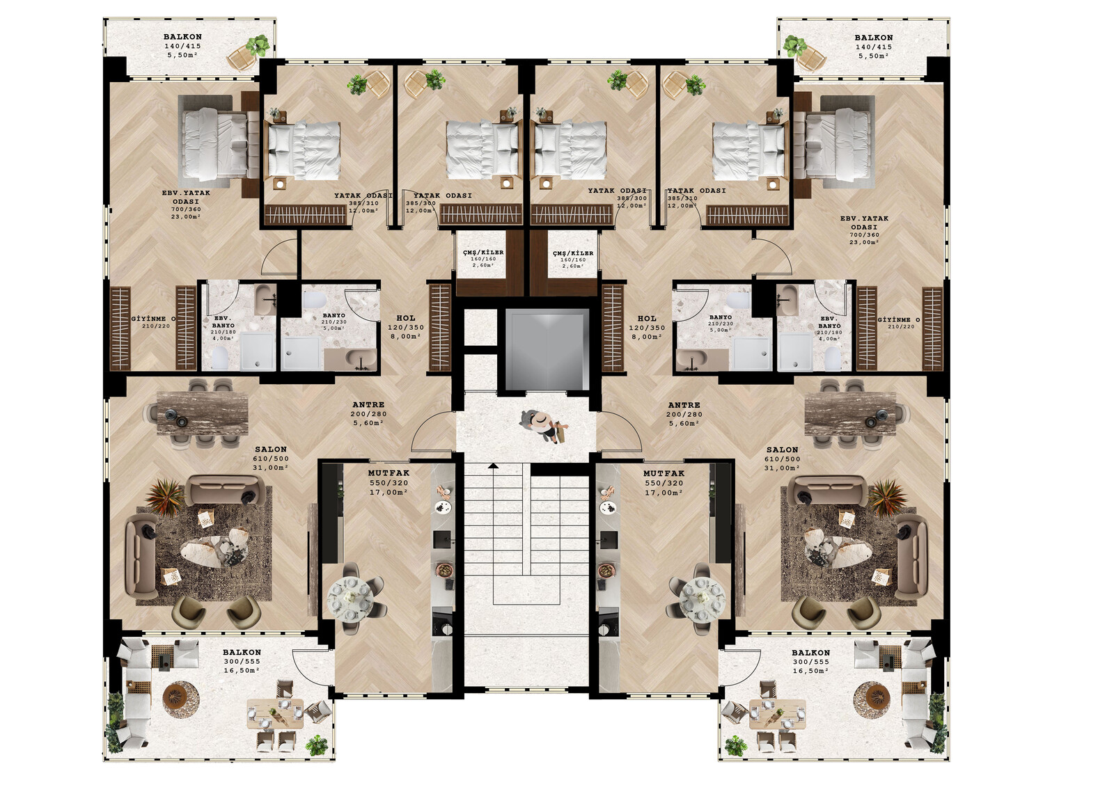- Zeminden ısıtma sistemi (termostatik ısı kontrollü) ve yoğuşmalı kombi